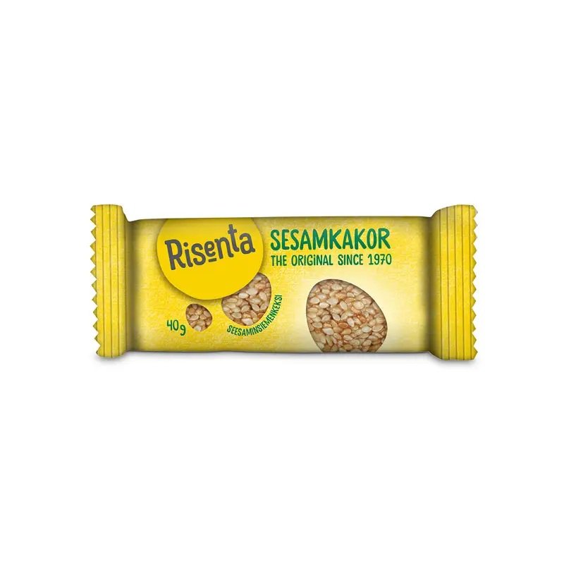 Klassiske sesamkager fra Risenta. Tilbage i 1970'erne begejstrede Risenta hele landet med sine lækre sesamkager. Hvis caféer, butikker, fitnesscentre eller hoteller ønsker at tilbyde deres kunder et energiboost, en hurtig snack eller noget praktisk at tage med, er et produkt som dette perfekt. Sesamkager indeholder en høj andel af sunde fedtstoffer, der nedbrydes langsommere og giver en længerevarende mæthedsfornemmelse. Sesamkager er endda helt glutenfri!