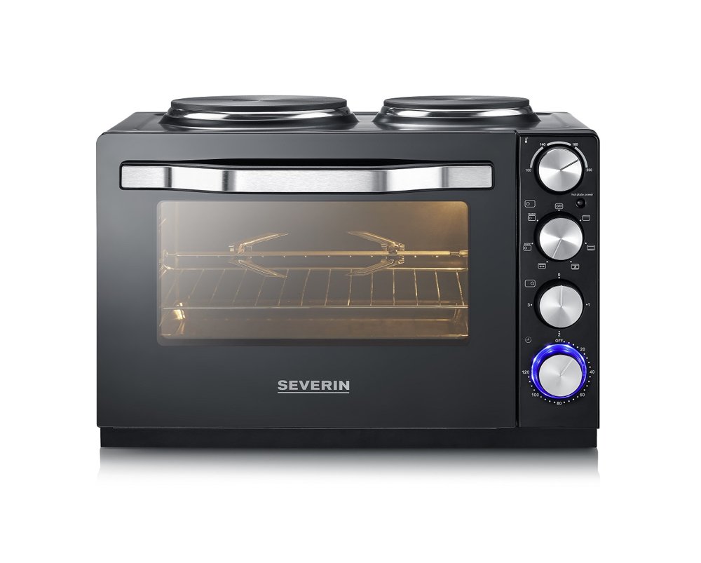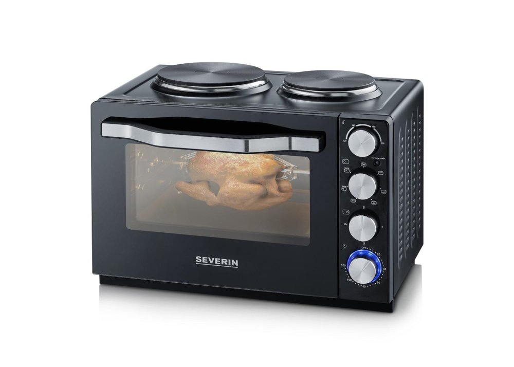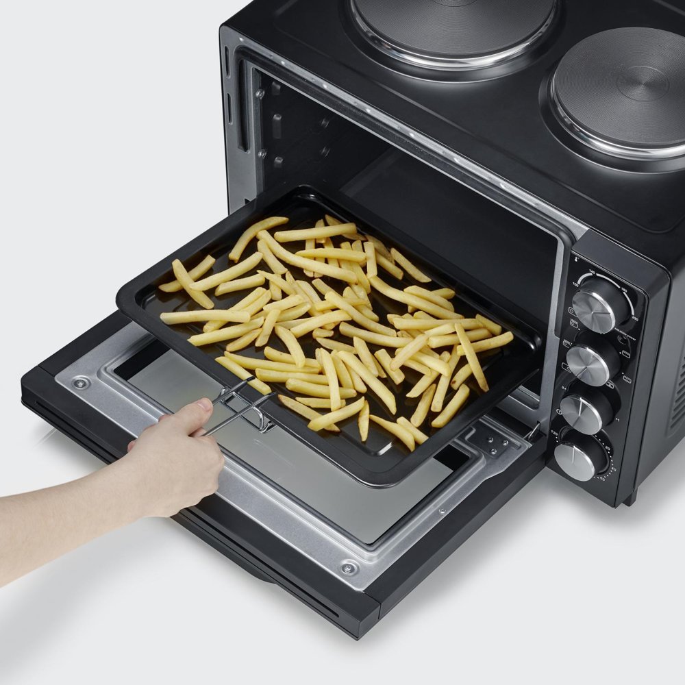 Bordpladekomfur i et stilfuldt sort design. Sæt stikket i stikkontakten, og du har et funktionelt madlavningsområde. To støbejernskogeplader og en 30 liters ovn. Fungerer perfekt i alle typer boliger. Godkendt i henhold til de seneste EU-krav. Ovnen har varmluftfunktion for effektiv og god madlavning. Hvis du ønsker en flot grillet kylling, er der et roterende grillspyd, der gør kyllingen gyldenbrun og sprød.