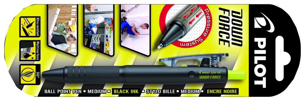 Down Force er en ballpointpen til skrappe miljøer! Den skriver på de fleste underlag selv under fugtige forhold. Pennen kan skrive i 360 grader og består af slagfast plast. Clipsen kan anvendes 100.000 gange, og pennen er forsynet med et hul, så den kan hænges i en kæde.