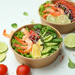 Stilren engangsskål i karton med en kapacitet på 1100 ml – perfekt til salater, poke bowls eller varme retter. Med indvendig belægning, der gør den væsketæt og mikroovnssikker.