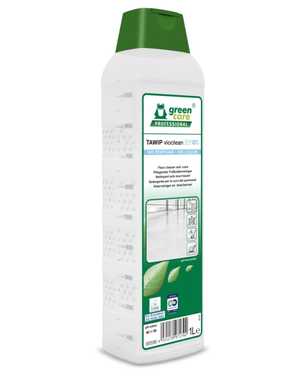 TAWIP vioclean zero% er et gulvrengøringsmiddel med ekstra plejende effekt og fremragende miljøegenskaber uden parfume eller farvestoffer. Det tager højde for biologiske cyklusser, beskytter menneskers sundhed og rengøringspersonalets sikkerhed. TAWIP vioclean zero% forbedrer arbejdssikkerheden og sikrer perfekte rengøringsresultater ved lave koncentrationer. Den naturlige kokosoliesæbe i sammensætningen beskytter gulvet mod udvaskning og efterlader en beskyttende film med antistatisk virkning, samtidig med at den reducerer risikoen for at glide i overensstemmelse med DIN 18032-2. ESD-godkendt!