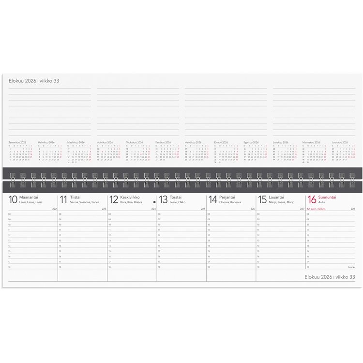 Burden Pöytätiima Eco-kalenderen har en ugeoversigt med timeinddeling fra kl. 08–18 samt månedsskemaer for hele året. Under omslaget af genanvendt karton finder du navnedage, nationale helligdage, flagdage, månefaser samt årsoversigter for indeværende og kommende år.