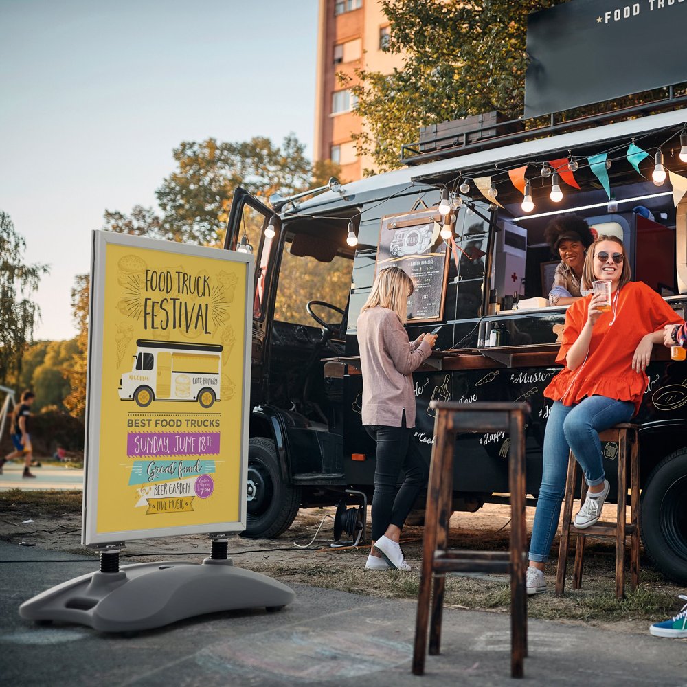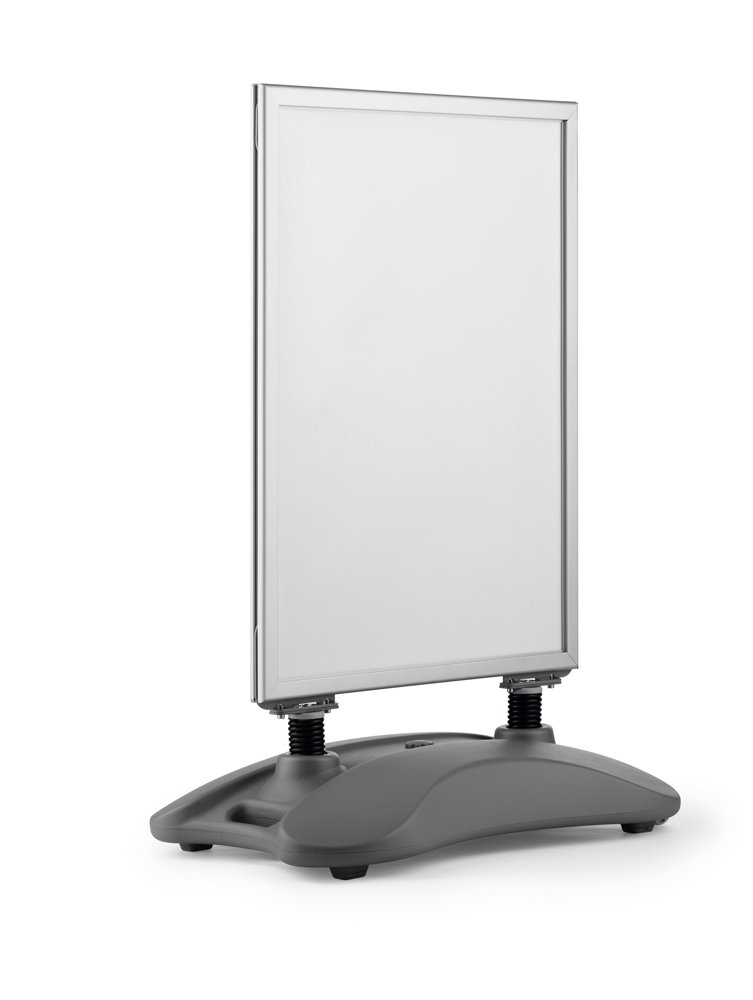Dobbeltsidet gadeskilt med en robust base, til A1-format. Vejrbestandig takket være UV-stabil frontplast og gummitætning, der beskytter mod vand.