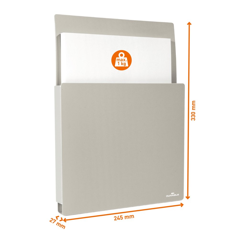 Papirbakke, formularbakke, brochureholder, dokumentholder - uanset hvad du kalder det, er INFO BOX A4 selvklæbende, en robust bakke lavet af 95-100% indsamlet genbrugsplast, grå polypropylenplast. Bakken rummer 22 mm tykke bundter af informationsark, spørgeskemaer, prislister og andre oplysninger, der skal være tilgængelige i papirform på messer, i venteværelser, udstillingslokaler, receptioner og andre steder. Denne model er permanent selvklæbende og er derfor nem at sætte op uden brug af værktøj. Belastningsevne på op til ca. 1 kg.
