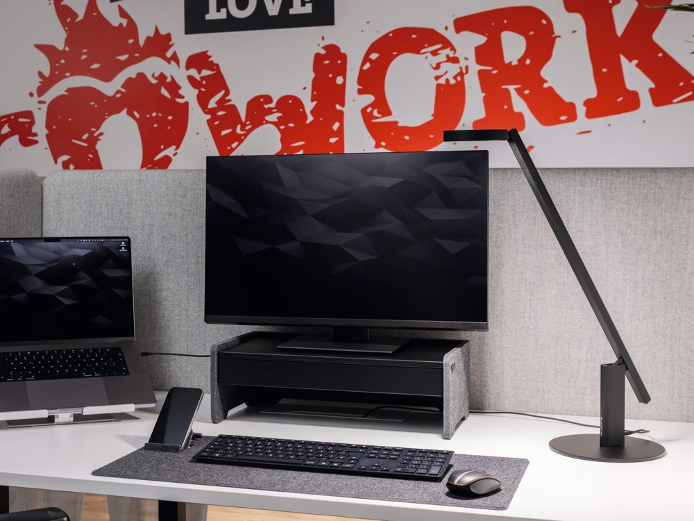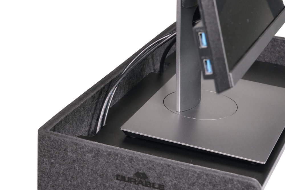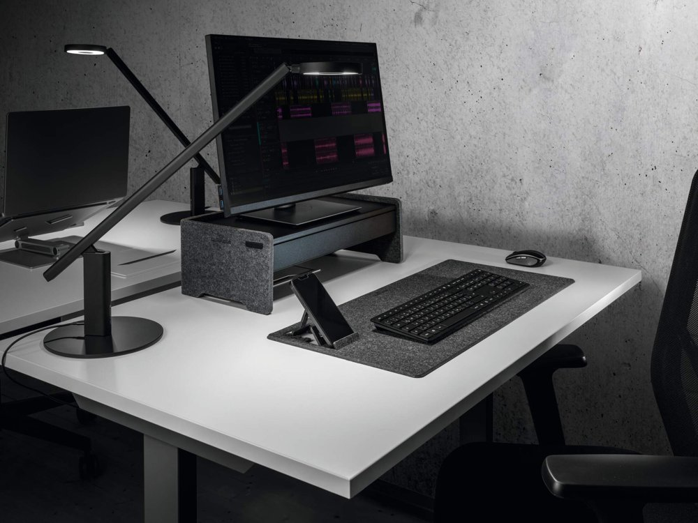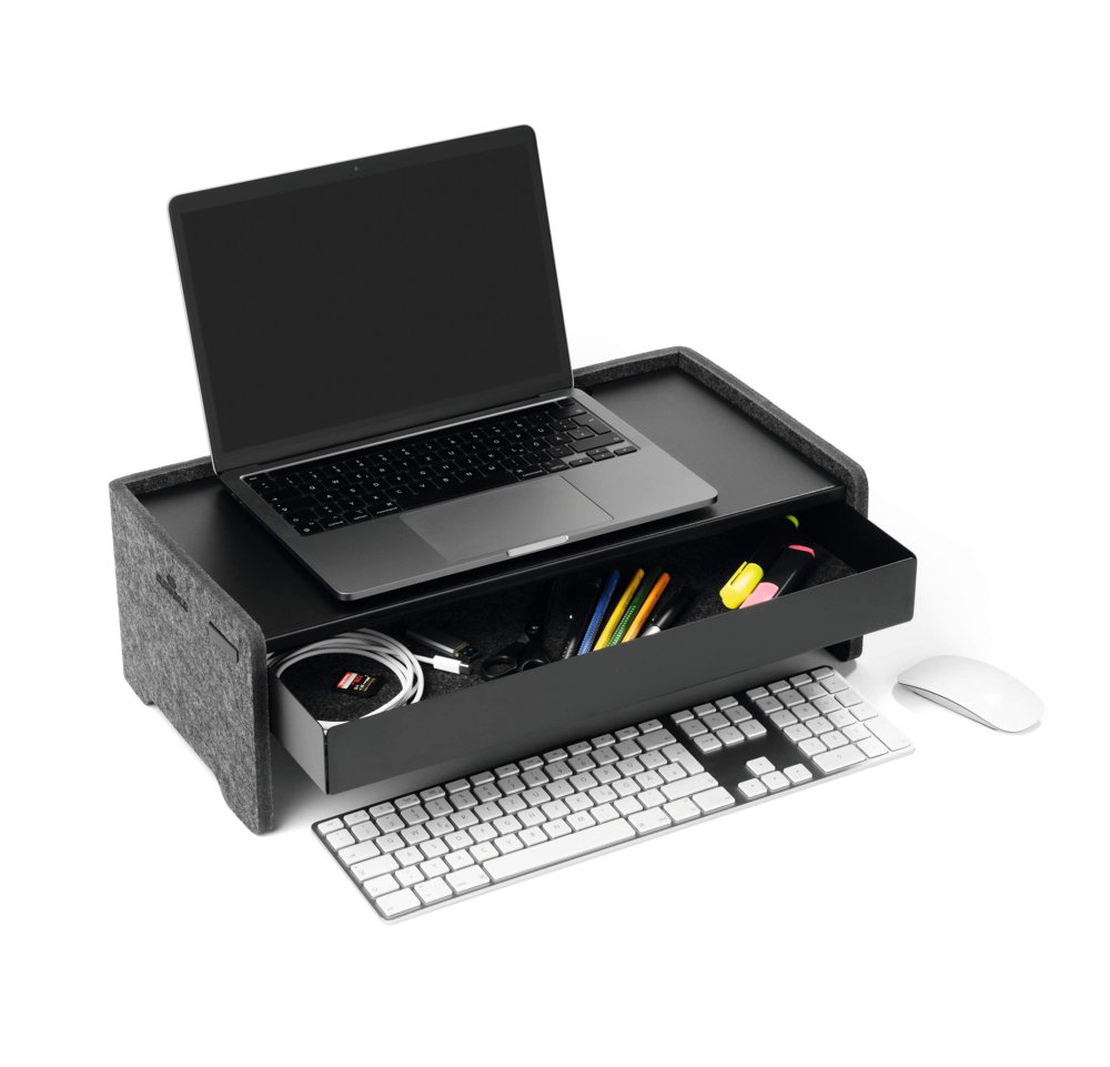 • Ergonomisk monitor stander. justerbar på 3 højder til skærme og bærbare computere fremstillet af 60 % genanvendt PET-filt