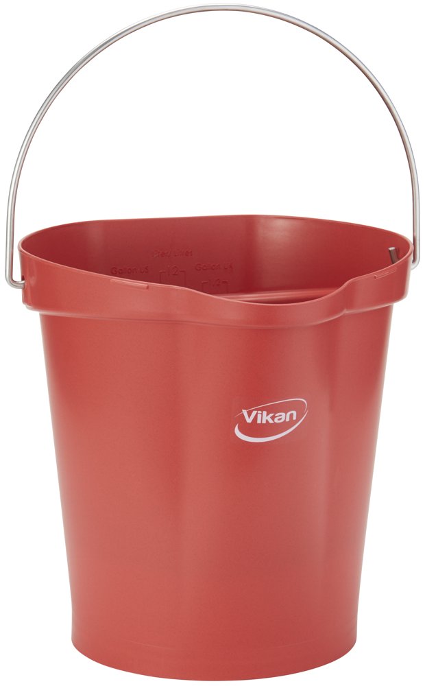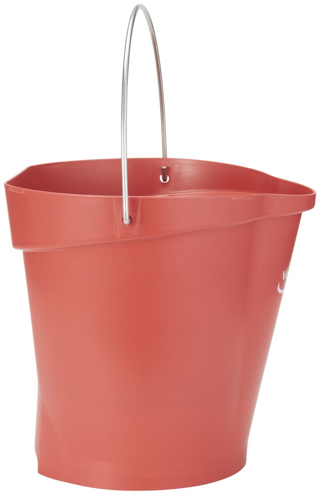 Denne spand er ideel til transport af rengøringskemikalier og både varme og kolde fødevarer og ingredienser. Den har en drypfri hældetud og en hævet bund med et håndtag i rustfrit stål. Den har også en indvendig måleskala med forskellige måleenheder. Den flade side forhindrer spild, og spanden har et tilhørende vægophæng (16200) til praktisk opbevaring