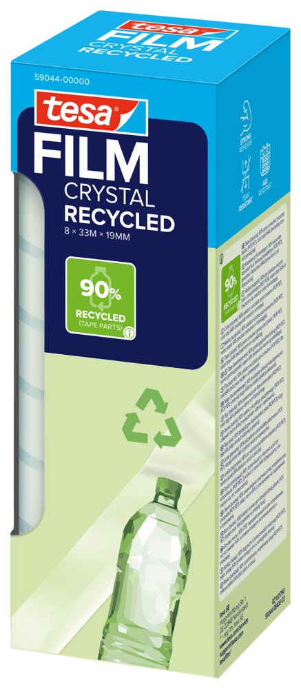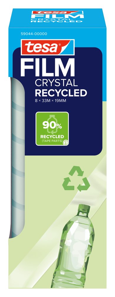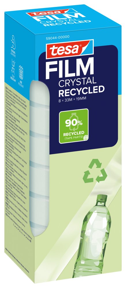tesafilm® fremstillet af genbrugte PET-flasker – transparent tape med stærk vedhæftning. Perfekt til limning, emballering, fastgørelse, dekoration eller reparation. Rullens kerne er desuden fremstillet af 100 % genbrugsplast.
