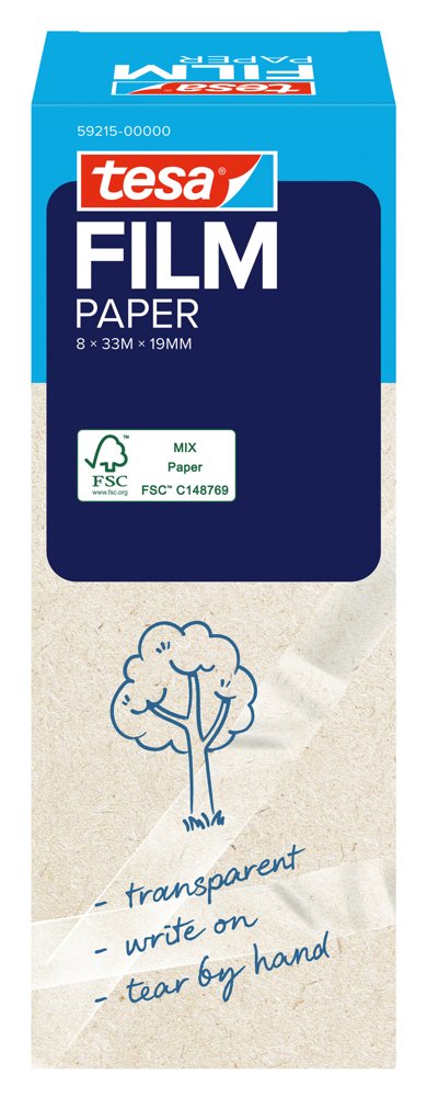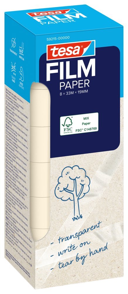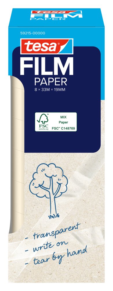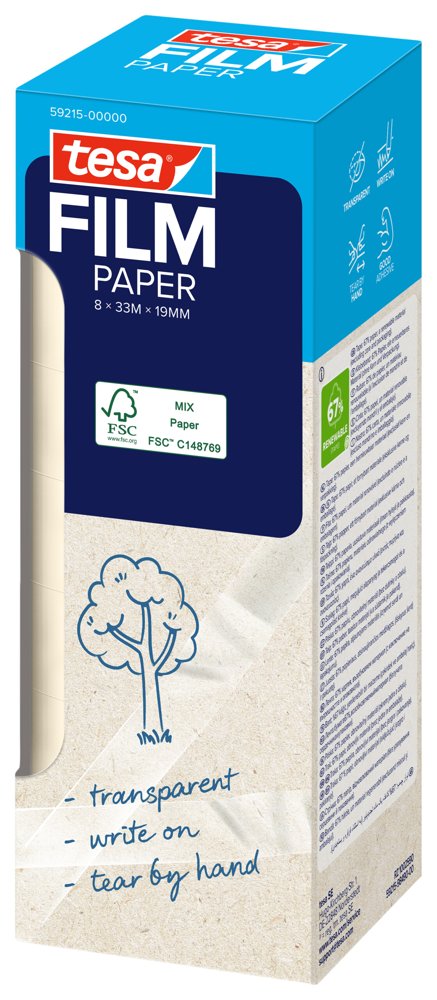 Det gennemsigtige tesafilm® PAPER klæbebånd er fremstillet af 67% papir (ekskl. kerne og emballage) og er perfekt til indpakning, fastgørelse, mærkning eller reparation. Det er næsten usynligt på lyse overflader, kan rives over med hånden og skrives på. Fremstillet af FSC®-certificeret papir (FSC® C148769).