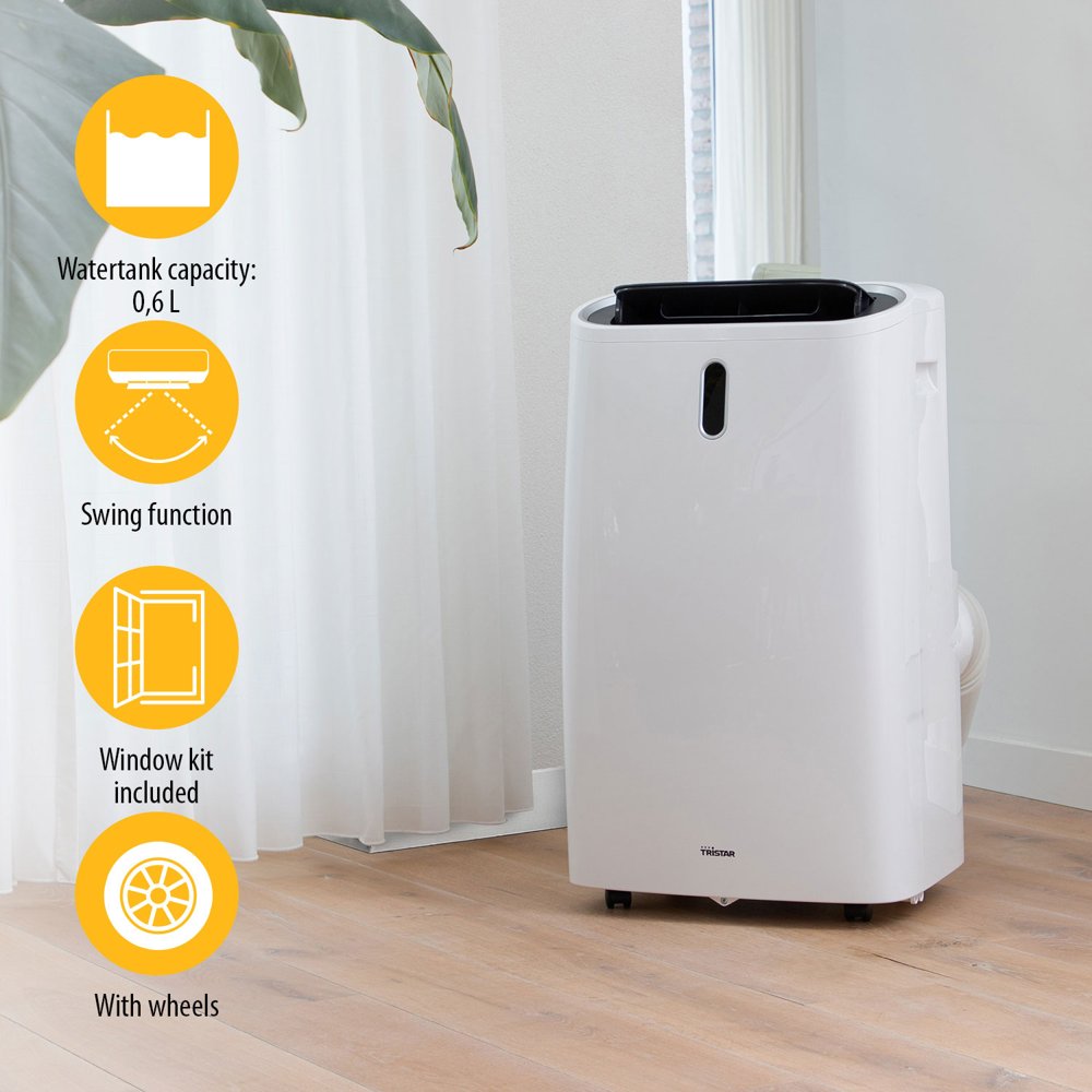 Tristar AC-5552 er et kompakt og fleksibelt klimaanlæg, der hurtigt og effektivt sænker temperaturen i hjemmet eller på arbejdspladsen og giver dig et behageligt indeklima året rundt.
