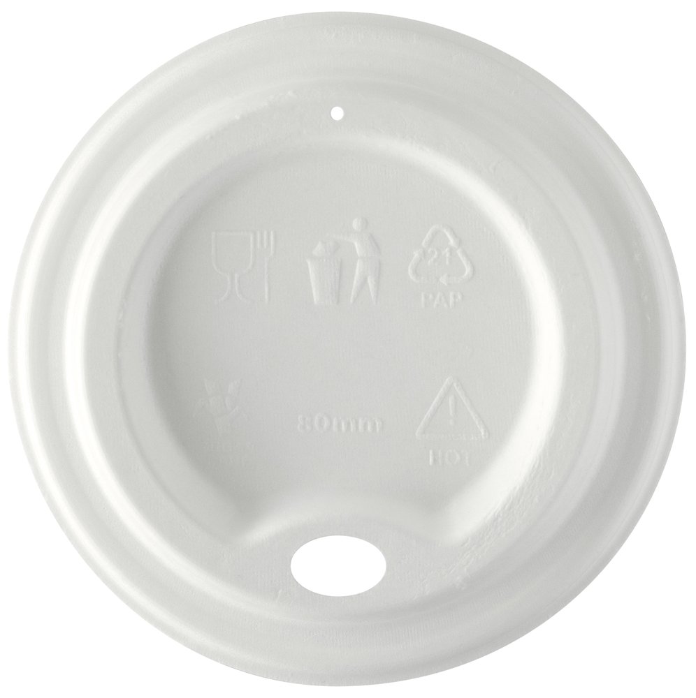 Låg til Vegwares 79-serie varme bægre. Et låg til varm kaffe eller te, der skal medbringes. Lavet af genbrugte plantefibre. Off-white farve, præget med Vegware-tekster. Prisvindende kvalitet fra Vegware, lavet af planter. Designet til industriel kompostering, lavet af genanvendelige materialer.