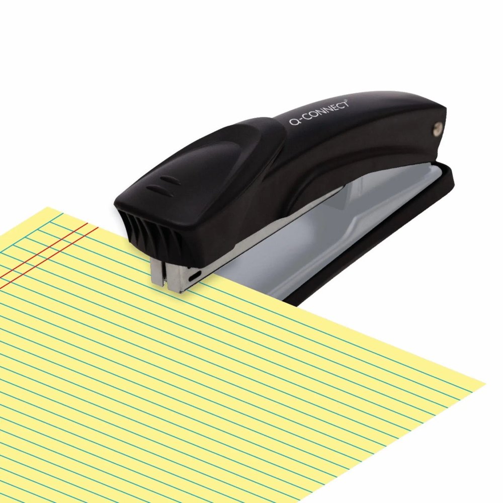 Q-Connect helstrimmel metalhæftemaskine. Kvalitetskonstruktion i metal med ABS-hætte for komfort. Accepterer nr.26/6 og 24/6 hæfteklammer med en kapacitet på 20 ark og en halsdybde på 76 mm. Farve - Sort.