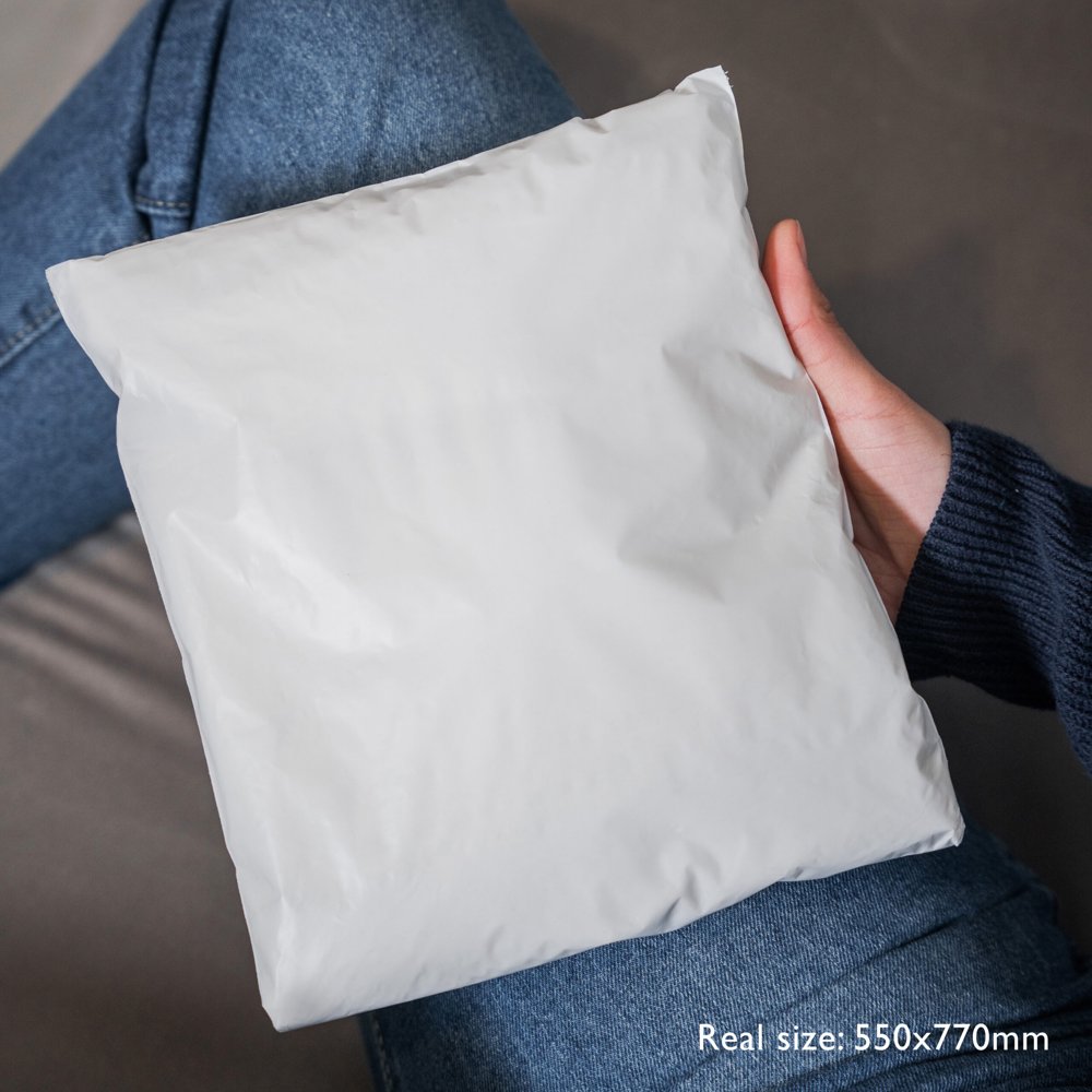 Q-Connect Hvide, ikke-gennemsigtige forsendelsesposer med sort inderside, fremstillet af 100 % genanvendt materiale. 3-lags holdbar PE-film 50 micron. Kurérposerne er holdbare, vandtætte og modstandsdygtige over for rifter og punkteringer. De har en stærk selvklæbende lukning med en enkelt strimmel. Posens mål: 550 x 770 mm. Kasse med 100 stk.