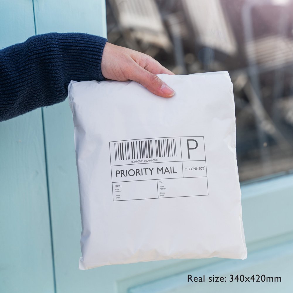 Q-Connect Hvide, ikke-gennemsigtige forsendelsesposer med sort inderside, fremstillet af 100 % genanvendt materiale. 3-lags holdbar PE-film 50 micron. Kurérposerne er holdbare, vandtætte og modstandsdygtige over for rifter og punkteringer. De har en stærk selvklæbende lukning med en enkelt strimmel. Posens mål: 340 x 420 mm. Æske med 100 stk.