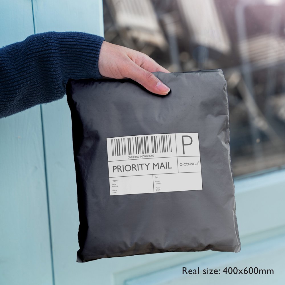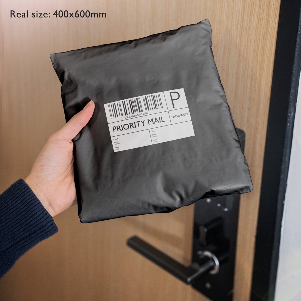 Q-Connect sorte, uigennemsigtige forsendelsesposer, fremstillet af 100 % genanvendt materiale. 3-lags holdbar PE-film 50 micron. Kurérposerne er holdbare, vandtætte og modstandsdygtige over for rifter og punkteringer. De har en stærk selvklæbende lukning med en enkelt strimmel. Posens mål: 400 x 600 mm. Æske med 100 stk.