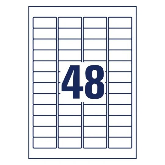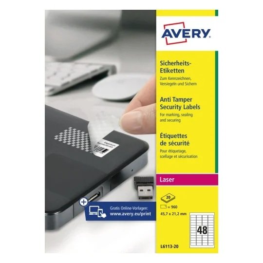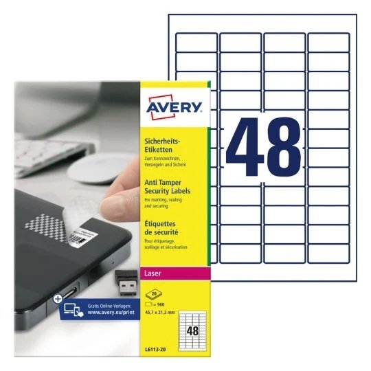 Avery L6146-20 sikkerhedsetiketter har 48 etiketter/ark og 960 etiketter/pakke, hver etiket måler 45,7 x 21,2 mm. Etikettens størrelse er velegnet til mærkning af genstande såsom håndværktøj, mobile enheder såsom bærbare computere og tablets samt værdigenstande i hjemmet såsom smykkeskrin, malerier, små interiørartikler osv.
