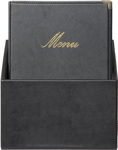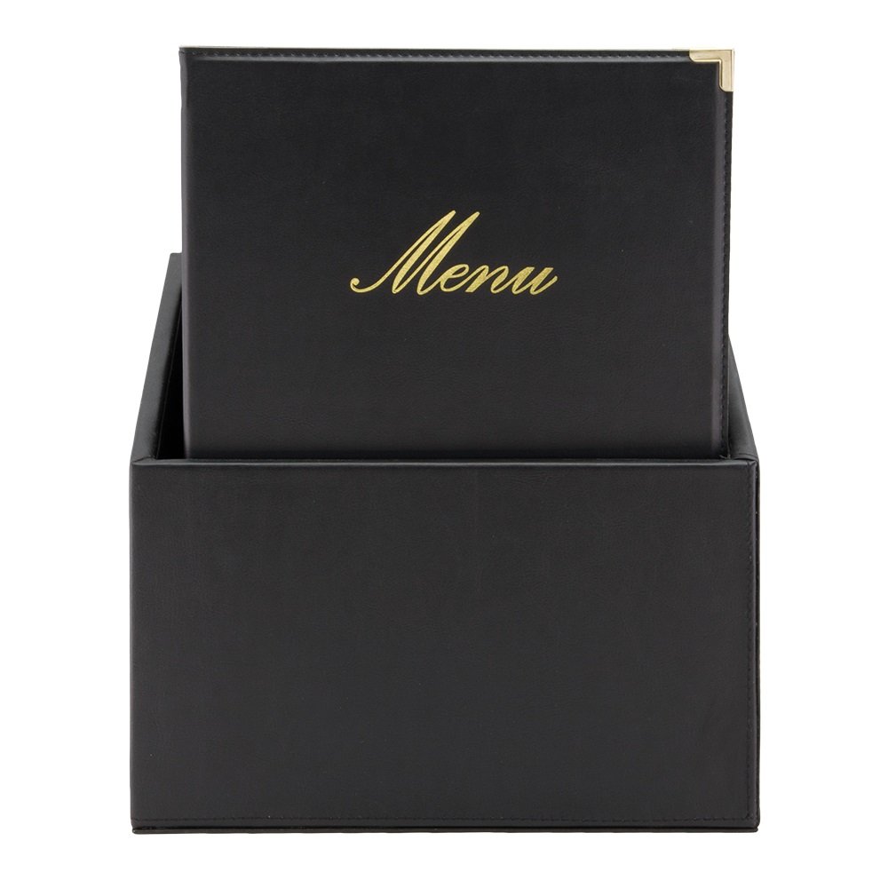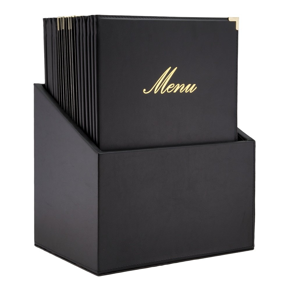 Sæt med Securit® A4 Classic Menuomslag og opbevaringsboks. Håndsyede, klassiske menuholdere i læderstil med ""Menu"" printed i guldfarve, er perfekte til traditionelle barer og restauranter. Dette sæt med 20 menuomslag kommer i en læderboks, og hver indeholder en dobbeltsidet lomme til 4 x A4-sider, som let kan udvides.