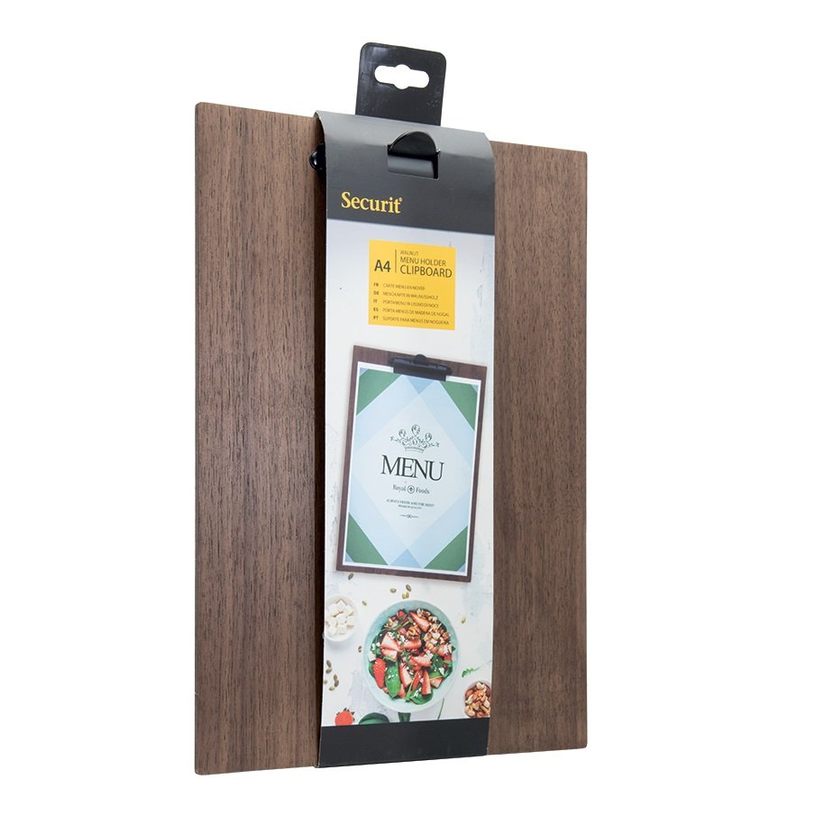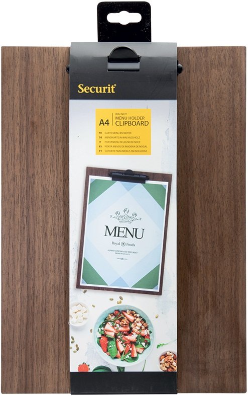 De førsteklasses naturlige materialer i Securit® A4 Walnut Clip Menuholder er en tidløs klassiker. Denne håndlavede menuholder lavet af lakeret valnøddetræ er et ideelt valg til moderne barer og restauranter, der foretrækker et luksuriøst naturligt udseende. Menuholderen har præcisionsskårne, glatte kanter og en sort metalclip, der gør det let at udskifte menusiderne.