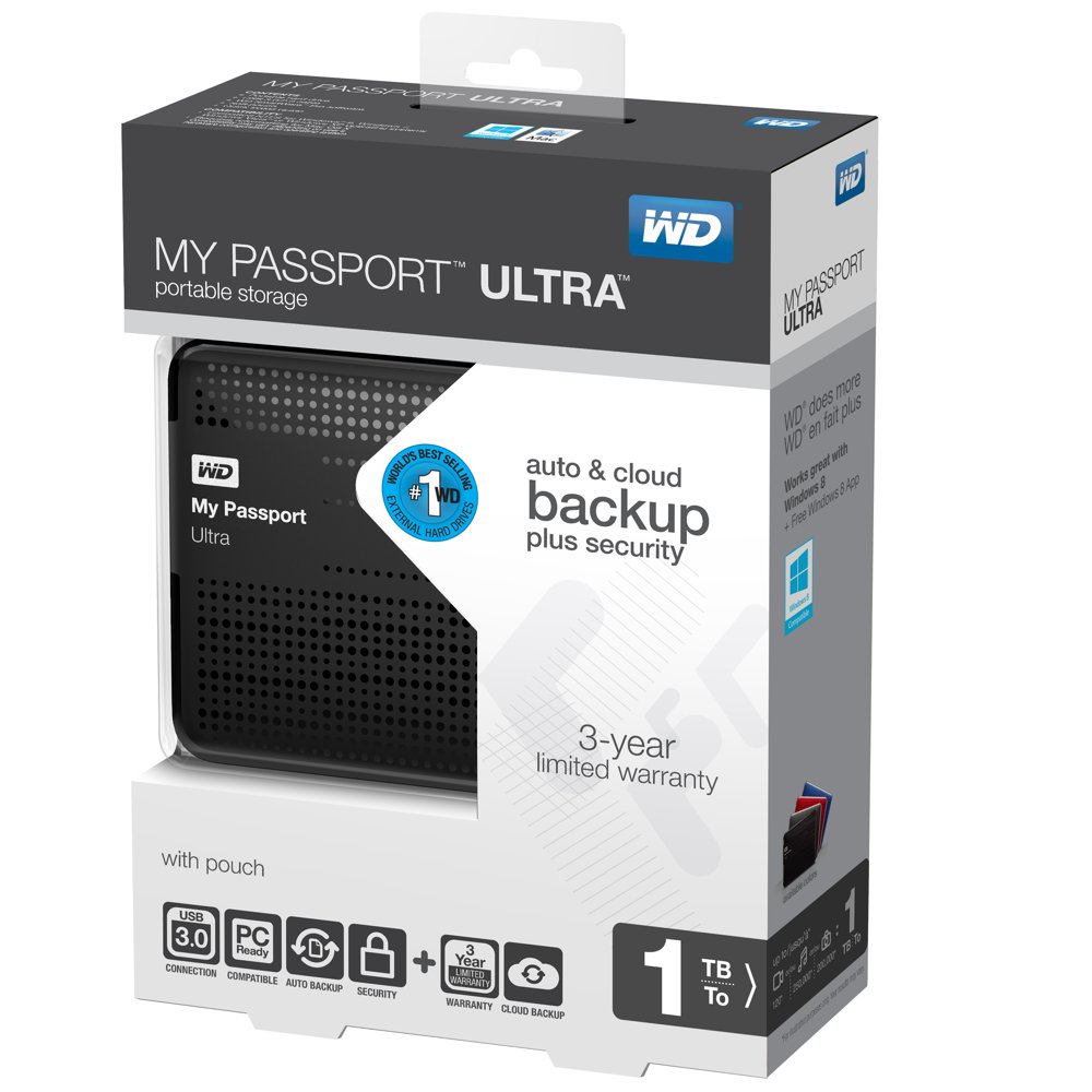 My Passport Ultra leverer USB 3.0-ydelse og høj kapacitet i et strømlinet design. Den er forsynet med softwaren WD SmartWare™ Pro til automatisk sikkerhedskopiering til selv disken eller til din konto hos Dropbox™. Beskyt dine filer med adgangskode og hardwarekryptering. En 3-års begrænset garanti og blød taske beskytter din disk. Den er den perfekte partner til alle, som har brug for at tage deres digitale indhold med sig, når de rejser.