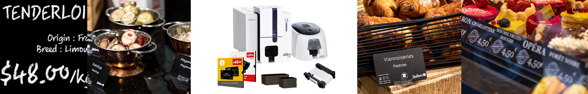 Edikio, skabt af Evolis, er den ultimative løsning til at tilføje et strejf af elegance og funktionalitet til fødevarerelaterede miljøer. Uanset om det er i charcuteriet, ved hotellets morgenbord, i caféen eller fine dining, så opfylder Edikio behovene. Med muligheden for at printe på certificerede plastikkort eller endda træ, opfylder Edikio ikke kun hygiejnekrav, men markerer også sit engagement i bæredygtighed.